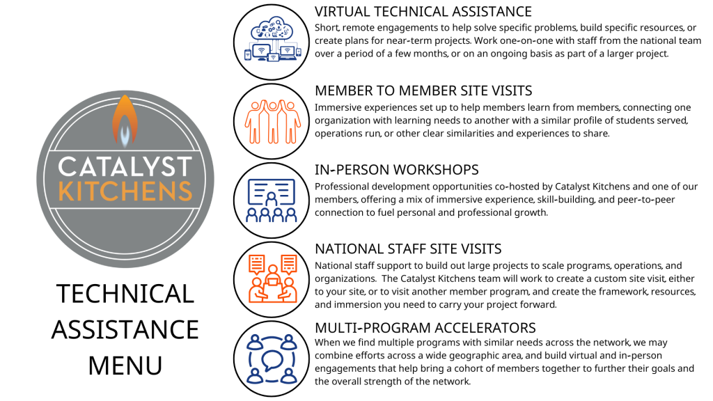 We also recognize that sometimes, certain projects get more complicated than a few emails, events, or resources can help with. That is why, in 2025, Catalyst Kitchens launched a dedicated technical assistance portfolio as an addition to our existing member services. You can read more about the exact details in our Theory of Change, which was published at the end of 2024 and written with the help and feedback of our members and our board.